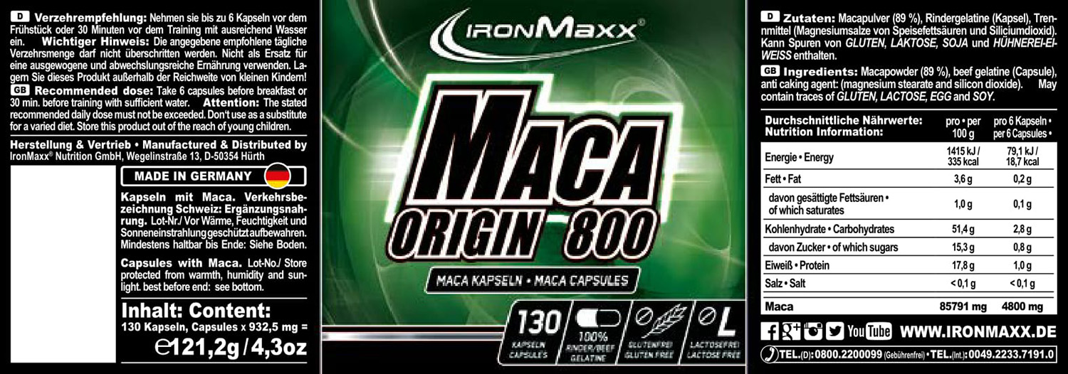 Macapulver, Rindergelatine (Kapsel), Trennmittel (Magnesiumsalze der Speisefettsäuren, Siliciumdioxid). Kann Spuren von Gluten, Laktose, Soja und Hühnerei-Eiweiß enthalten.